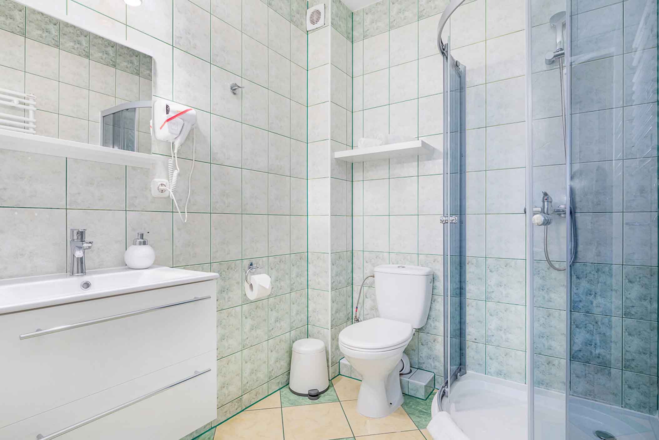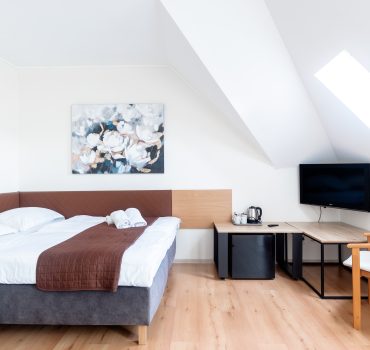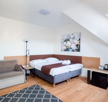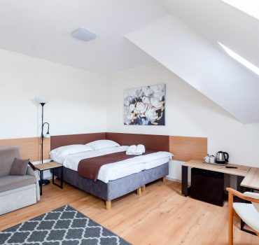 A może nieco większą grupką z rodziną? Pokój Studio to przestronny, dwuizbowy nocleg, gdzie wypocznie nawet do pięciu osób! Do niego dołączona jest łazienka z prysznicem i balkon, dzięki czemu spędzisz komfortowo urlop w Villi Zdrój. Przyjeżdżając do nas, nie musisz zabierać ze sobą nic poza ubraniami i ulubionymi kosmetykami. Na wyposażeniu Pokoju Studio znajdziesz bowiem ręczniki, czajnik, szklanki, talerze, sztućce i pozostałe potrzebne do codziennego funkcjonowania wyposażenie.