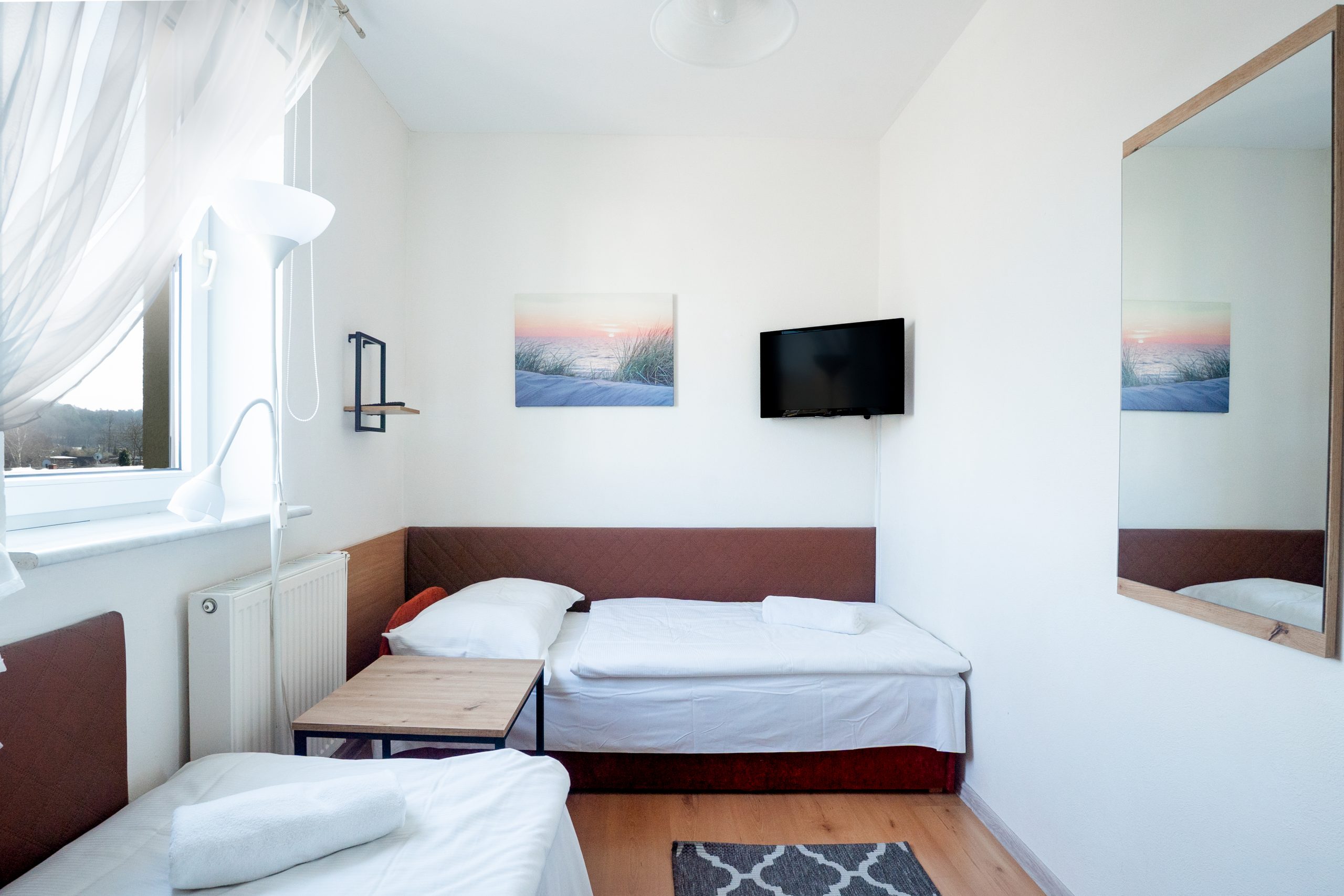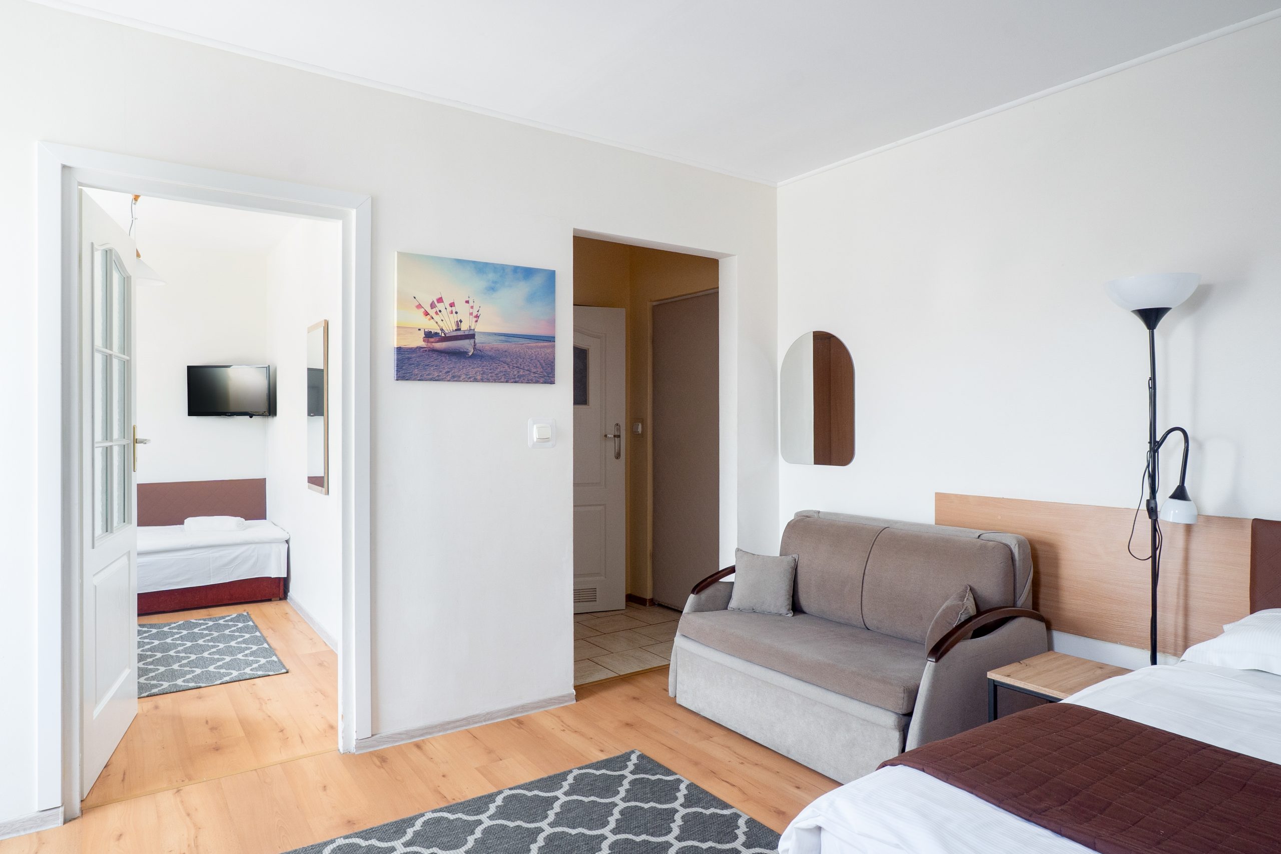Łóżka: 1 podwójne 1 jedna rozkładana sofa (pokój przejściowy) oraz 2 łóżka pojedyncze (drugi pokój)